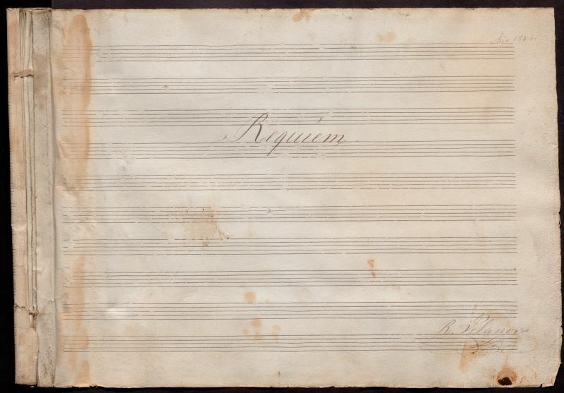 - Fongs 1 qd ap. A les PS d'instruments de vent [Tpa, Tbó, Fg 1/2, Ob 2, Cl 1/2, Ftí, Timpani, Cb (1 ex)], a la coberta hi apareix: "Requiem (PS de l'instrument que sigui) / Para cuando se toque á grande / Orquestra. La PS de Cl 2 té un forat a la coberta, com una cremada. Moltes PS tenen els marges motl danyats, i estan escrites amb tinta àcida que comença a deixar forats i marques al paper. A la Coberta de la PG hi ha el tampó amb tinta blava: "Deposit Vilanova". A la PS de Cta (de claus) hi apareix al marge dret superior: "Les victimes Bilbao". La PS de Campana és només pel fragment del Sanctus.
