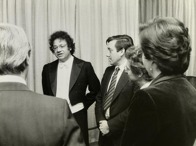 [Retrat de personalitats, Antoni Sàbat i el conseller Max Cahner entre d’altres, parlant amb el director Fernando Lozano el dia del concert de l’Orquestra Filharmònica de la Ciutat de Mèxic al Palau de la Música Catalana]