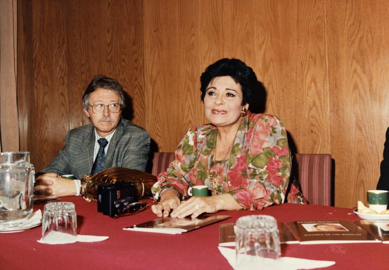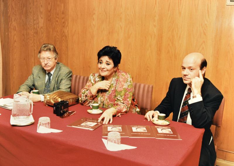 - 308.1-308.3 Antoni Sàbat, Victòria dels Àngels i Albert Guinovart a la roda de premsa. 308.4 Primer pla de Victòria dels Àngels a la roda de premsa.