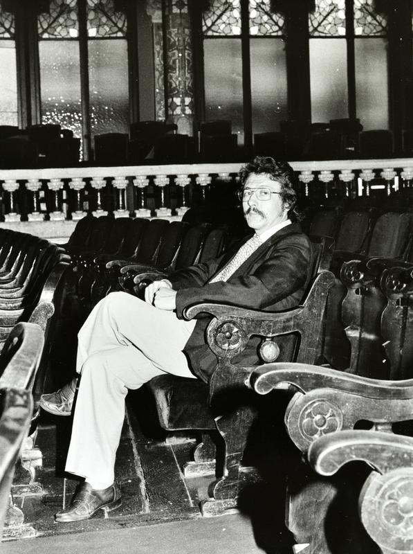 334.1 Retrat de mig pla d'Antoni Sàbat al balcó de la primera planta del Palau de la Música Catalana. 334.2 Retrat de cos sencer d'Antoni Sàbat, assegut a les butaques de la sala de concerts del Palau de la Música Catalana.
