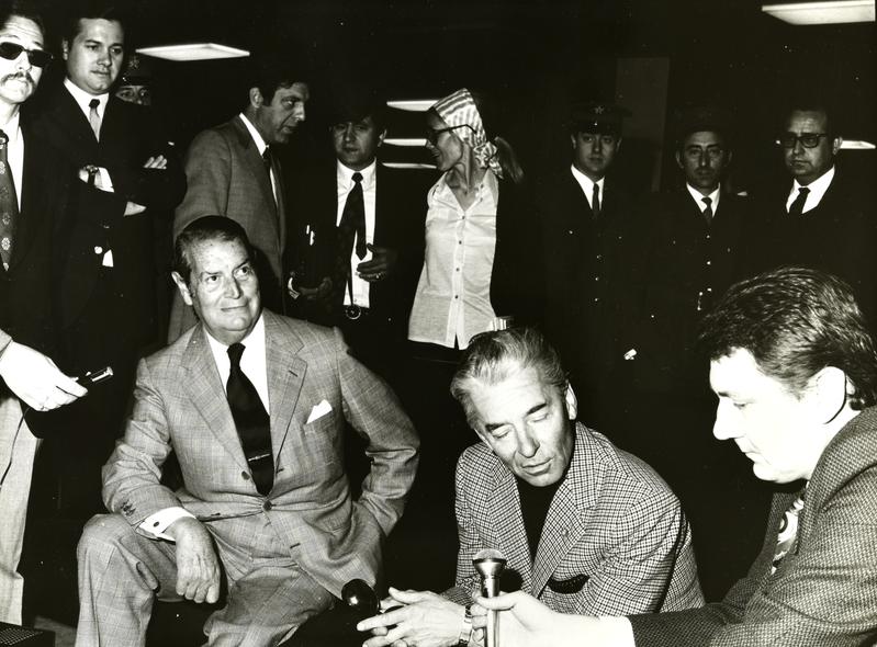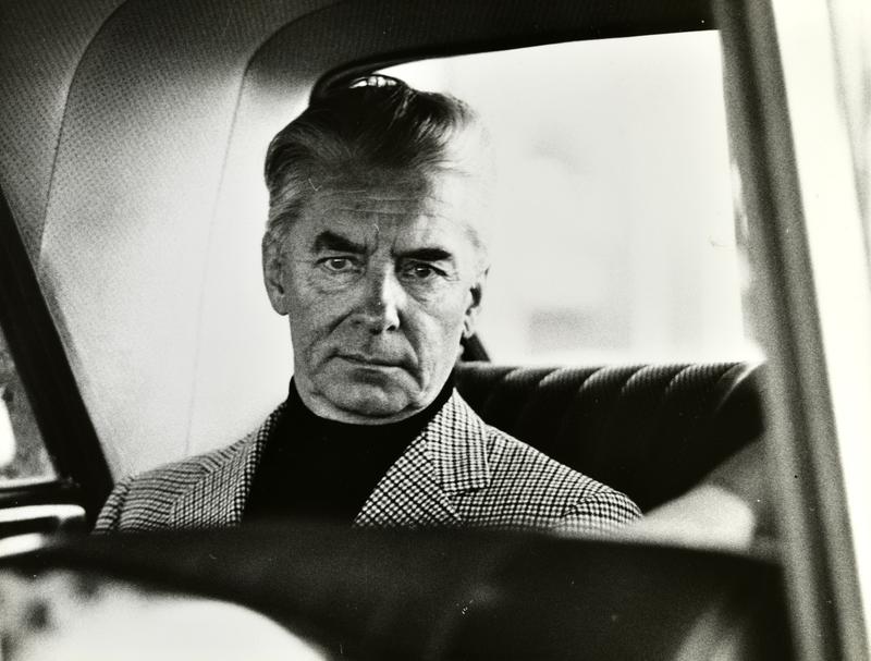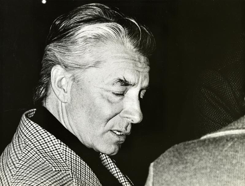 [Arribada i conferència de premsa del director Herbert von Karajan a l’aeroport de Barcelona]