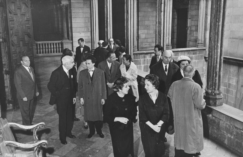 En R 0373.01: Al centre de la imatge: Maria Canals, un representant de l'Ajuntament de Barcelona i el matrimoni Gagnebin; darrere d'ells, Frederic Mompou; (part esquerra): Concepció Brunet, secretària del Concurs, i darrere seu, Carme Bravo de Mompou (amb gorra blanca) i Salvador Sindreu, al costat de Maria Canals, Alfredo Mandelli. En segona fila, Helene Rieder, no id., sra. de Cubiles i José Cubiles.