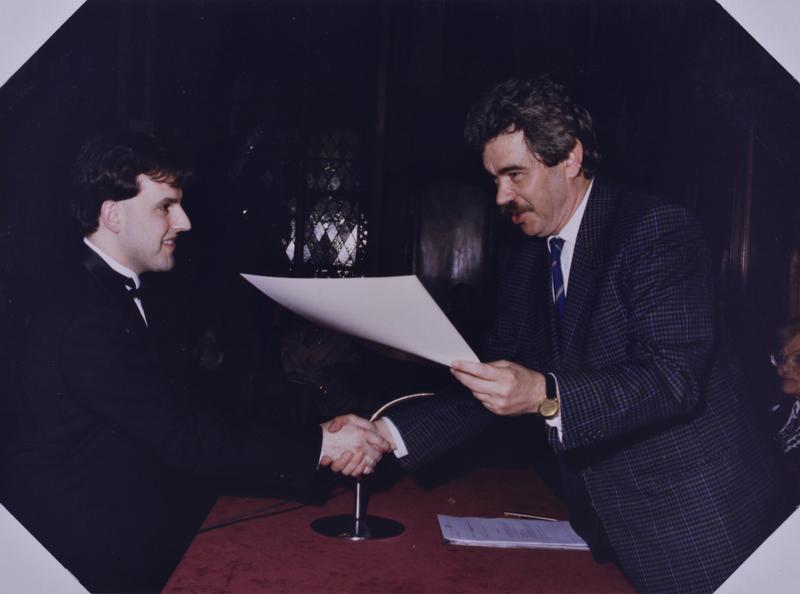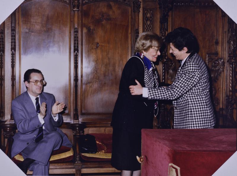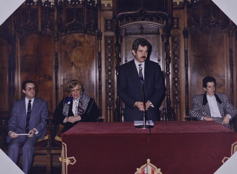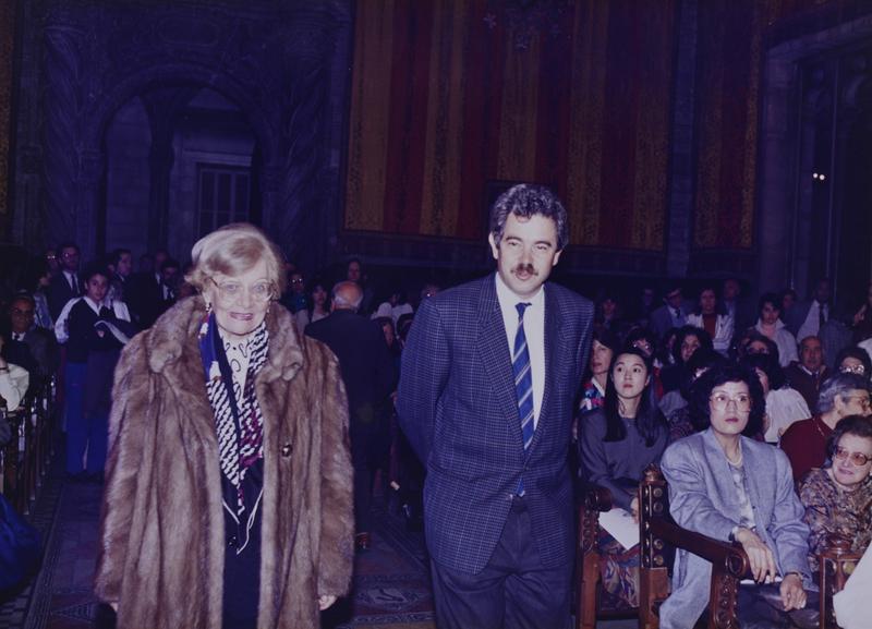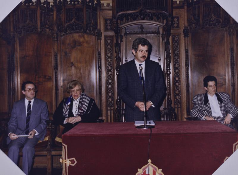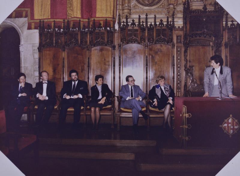 - En 0562.01: Maria Canals i l'alcalde Pasqual Maragall. En R0562.05: discurs d'Eulàlia Vintró. Asseguts: Carlos Cebro, Klaus Kaufmann, Gerassimos Kakalis, no id., no id., Maria Canals.